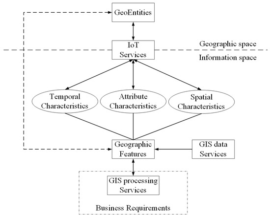 The requirements of GIS-oriented IoT service application are completed through the interaction between the device and the geo-entity. The basic element of geographical space is the geo-entity which can be defined as a phenomenon that occupies a position in geographical space. Geo-entity cannot be divided into similar phenomena in the real world and can be expressed as simple abstract geometric objects including the point entity, the line entity, the surface entity and the body entity [58]. A city, a car moving on the road or an air quality monitoring point all can be regarded as a geo-entity.