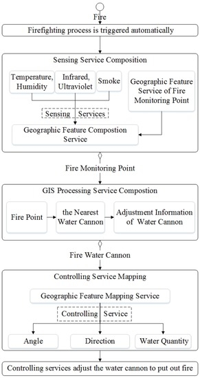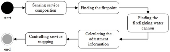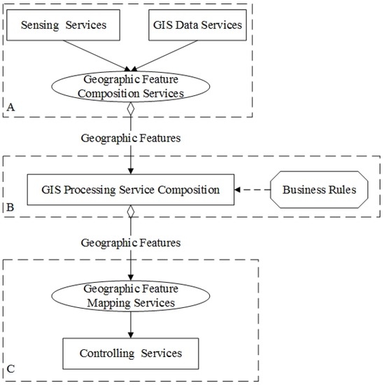 Web services are independent and modular software applications, and can provide unique functions or interoperability between different existing applications [26]. However, an IoT service only has a single function, and can only sense one characteristic of a geo-entity in general. In most cases a single IoT service is unable to meet the business goal. Web service composition is a promising solution which can compose the functions of two or more Web services into one service to meet the needs of user [27]. Therefore, it is necessary to compose multi IoT services and other related services in a certain way to meet the requirements of complex business applications. At present, there are many researchers studying the service composition. The theories or technologies consist of the workflow technology, the artificial intelligence method, the formal method, etc.