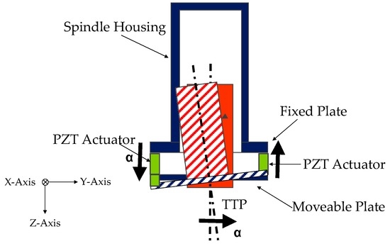 This novel module is a smart element that deals with the vibration mitigation in micro-cutting processes. The main principle is to screen the vibratory frequency in order to control the displacement at the tool tip point of the machine. The proposed approach integrated mechatronic and control theories in the design phase. The device aims at increasing the quality of workpiece finishing through an AVC architecture based on high performance PZT-actuators. It is based on the Stewart platform [22,23,24,25,26], but it has only three degrees of freedom (DOFs) (two rotations on X, Y axes and one displacement on the Z axis). Figure 2 shows an overview of the AVC system that includes two platforms made of an Al alloy. The fixed platform is bound to the machine tool’s vertical axis, and the mobile is linked to the frame of the spindle. Three PZT multi-stack actuators permit the relative movement of these two platforms. The functional concept focuses on the recognition of undesirable displacements at the tool tip point. When a deviation is measured at the tool tip point (TTP), 3 actuators are switched on in order to smooth pulsations and limit their consequences on the surface, as shown in Figure 3. The piezo-electric element is able to manage compressive axial loads, but precautions are needed with tensile and/or shear forces; for this reason, special flexures have been designed and integrated to prevent any breakage or failure. These flexural joints are able to avoid torsional and shear stresses to the piezo elements. A mechanical system provides the suitable stiffness to the actuators, avoiding undesired stresses and breaks. In additions, two flexural springs are located close to every actuator. They have high torsional and radial stiffness, nevertheless, they are free to move in the axial direction. The module is also equipped with three steel C-shaped plates to increase the stiffness, located between the fixed platform and the actuators. Furthermore, every flexural joint is connected to a cooler joint that provides compressed air against the actuator surface when the temperature exceeds 40 °C. Figure 4 illustrates the smart actuator designed and developed to satisfy the machining requirements.