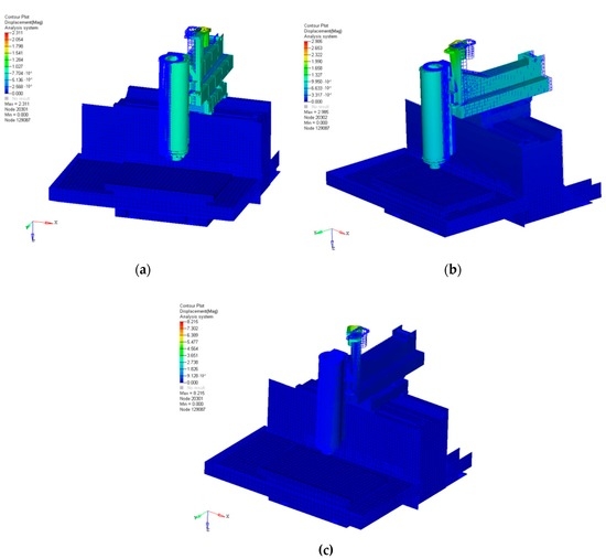 One of the most critical points in the control the AVC device is the identification of the correct mechatronic model; this includes a combination of multidisciplinary fields such as mechanical, electrical, control, and energy engineering. The first step is to evaluate the machine tool behavior using a set of simulations. In this way, a mechanical model may be represented by a Finite Element (FE) analysis. FE aims at describing the main characteristics of the machine tool, focusing on structural parts, links, and piezoelectric actuators (Figure 5). This study was developed on a commercial milling machine and the simulation results are presented in Table 3 and Figure 5. The FE model consists of approximately 150,000 elements.