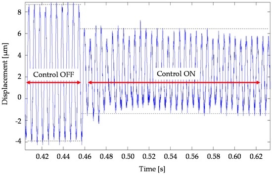 The main objective was to validate any different integrated model-testing control-schemes. A preliminary verification focused on a perturbation created by a digital input (sin-signal) to recreate the TTP displacement plotted in a time-domain. The simulation wanted to represent the undesirable, unbalanced tool rotation at 11,500 rpm. The control model was tested in both conditions (off/on) highlighting the effectiveness of the control system by 30–50% in terms of displacement amplitude reduction, as shown in Figure 6.