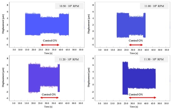 Simulation of activated/deactivate states of control of an unbalanced rotation at 11,500 rpm.