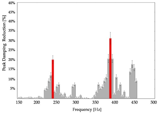 The FRF of Figure 11 underlines the comparison between the residual steady state of vibration amplitude and the uncontrolled states. The AVC module provides a suppression performance of 30%–35% at 380 Hz. Table 5 summarizes the main obtained results from experimental tests.
