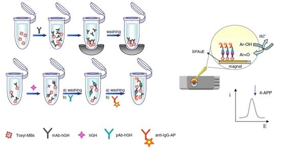 - Serafín, V.; Úbeda, N.; Agüí, L.; Yáñez-Sedeño, P.; Pingarrón, J.M. Ultrasensitive determination of human growth hormone (hGH) with a disposable electrochemical magneto-immunosensor. Anal. Bioanal. Chem. 2012, 403, 939–946. [Google Scholar] [CrossRef] [PubMed]