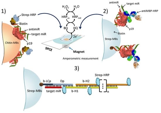 Pingarrón´s group has developed recently different attractive strategies for miRNAs detection involving MMPs and amperometric detection using the system H2O2/HQ at SPCEs. Two of them are based on the employment of the viral protein p19 as specific bioreceptor for the selective capture (previously immobilized at Chitin-MMPs) [] or detection [] of duplexes of RNA formed by target miRNA and a specific biotinylated RNA probe hybridization in homogeneous solution or at the surface of Strep-MMPs. The commercial p19 used as receptor was cloned and expressed in Escherichia coli as a fusion protein with an amino terminal maltose binding protein (MBP) and a carboxy terminal chitin binding domain (CBD). Using Strep-HRP or an antiMBP-HRP for labeling, these approaches allowed LODs of 0.4 and 4.2 fmol of the synthetic miR-21 target. More recently, a novel approach involving a sandwich hybridization assay onto Strep-MMPs and hybridization chain reaction (HCR) amplification has been developed []. The target miRNA-21 contains 11-base complementary sequences to both the biotinylated capture probe (b-LCp) and the detector probe (Dp) (Figure 2). This latter acts also as the initiator strand of an HCR amplification in the presence of two biotinylated hairpin sequences leading to the formation of a long nicked double-helix structure bearing a large number of biotin molecules used to capture multiple HRP enzymes in a highly ordered way thus allowing an efficient amplification of the final amperometric signal. This HCR-sandwich based approach allowed a linear increase in the amperometric signal from 0.2 to 5.0 nM and a LOD value of 0.06 nM (5.0 fmol in 25 μL sample). The applicability of these three different approaches has been demonstrated for the determination of the mature miRNAs target directly in raw RNAt extracted from human tissues and cancer cells. It is worth mentioning that none of these approaches for miRNA determination requires previous reverse transcription into cDNA, which implies a lower cost and a shorter analysis time.