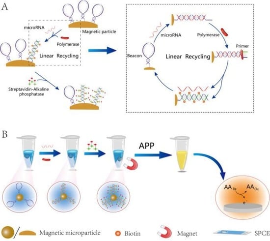 A MMPs-assisted multienzyme-functionalized isothermal strand-displacement polymerase reaction (ISDPR) was developed by Ma et al. [] for quantification of miRNAs. Recognition of aminated molecular beacons attached to HOOC-MMPs by target miRNA triggered a phi29-mediated ISDPR, which can produce biotin-modified sequences on the MMCs labeled with Strept-AP in a final step (Figure 3). The ascorbic acid (AA) generated by AP using 2-phospho-L-ascorbic acid (AAP) as substrate was detected by DPV upon placing the supernatant of enzymatic reaction at SPCE. This method provided a linear range extending between 10 fM and 10 nM and a LOD value of 9 fM for the target miRNA (miRNA-21), and also it was successfully applied to the determination of miRNAs in breast cancer tissues.