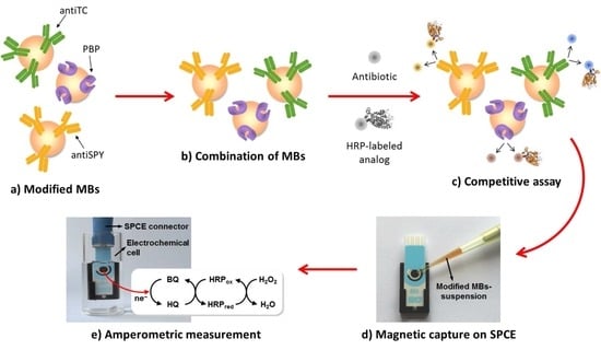 An interesting strategy for the rapid multiplexed screening of antibiotic residues in milk, applied to cephalosporins (CPHs), sulfonamides (SAs) and TCs, was reported by Conzuelo et al. []. This involved the use of SPCEs, a mixture of MMPs modified with 3-target specific, and the establishment of direct competitive assays with HRP-labeled tracers (Figure 4). Specific antibodies immobilized onto ProtG-MMPs and His6-tagged penicillin-binding protein (PBP) immobilized onto His-tag isolation-MMPs were used as selective capture microcarriers for SAs, TCs and CPHs, respectively. The amperometric responses measured at SPCEs using the H2O2/HQ system allowed to evaluate the extent of affinity reactions. Noticeably, this methodology makes possible discrimination between raw milk and uncontaminated UHT samples and samples containing antibiotic residues at the maximum residue limits (MRLs) in only 5 min, by applying a simple and short pretreatment.