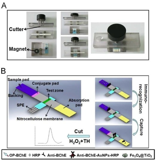 MNPs prepared by combination of iron oxides with other metal oxides possess improved properties for bioconjugation. Oxides that exhibit specific affinity to certain functional groups of interest are selected in this type of applications. For example, Fe3O4@TiO2 nanoparticles were used to develop two different configurations of electrochemical immunosensors for determining phosphorylated butyrylcholinesterase (OP-BChE), a biomarker of the exposure to organophosphorous pesticides (OP), in human plasma [,]. The magnetic nanomaterial was synthesized by a hydrothermal method and demonstrated a high selectivity for immobilizing the target OP-BChE by binding between the OP moiety and TiO2. Using this strategy, a first alternative consisted in the use of quantum dots (QDs)-tagged anti-BChE to prepare a sandwich-like complex, Fe3O4@TiO2/OP-BChE-anti-BChE-QDs, that can be magnetically isolated from the sample solutions and retained onto a SPCE. The cadmium from QDs can be detected by stripping SWV after platting the electrode surface with a film of bismuth. This immunosensor yielded a linear response for OP-BChE from 0.02 to 10 nM, with a LOD value of 0.01 nM []. More recently, the same group presented a disposable test-strip electrochemical immunosensor for determining OP–BChE where Fe3O4@TiO2 nanoparticles were adsorbed onto a test trip (Figure 5) and used to capture the target OP–BChE. Furthermore, recognition was made by using HRP and anti-BChE co-immobilized onto AuNPs. Once the sample solution containing OP-BChE migrates through the whole strip by capillary action, the test zone containing the immunocomplex is cutting to the SPCE cell, and detection by SWV is performed after addition of thionine and H2O2 [].