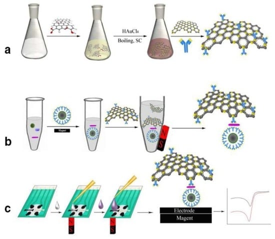 Fabrication of the electrochemical immunosensor for Salmonella pullorum and electrochemical detection: Synthesis process of rGO/Au/Ab2 (a); Capture of Salmonella pullorum from samples by MMPs (b); Put a MMPs-immunoconjugates drop on the SPCE and electrochemical detection (c). Reprinted from Ref. [] with permission.
