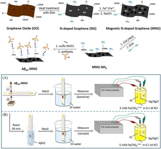 A magnetic nitrogen-doped graphene-modified SPAuE with immobilized anti-Aβ 1–28 antibody was used to determine amyloid-beta peptide 1–42 (Aβ42), which is a reliable biomarker for Alzheimer disease´s early diagnosis. Chemical doping with nitrogen constitutes an effective approach to improve the electrical conductivity of graphene providing a better biocompatibility and sensitivity for biosensing applications. Fe3O4 NPs were deposited onto graphene doped with nitrogen to obtain a magnetic nanomaterial to be further labeled with anti-Aβ antibodies through a crosslinking method with sulfosuccinimidyl-4-(N-maleimidomethyl)cyclohexane-1-carboxylate (sulfo-SMCC). The magnetic immunosconjugates (Aβab-MNG) were deposited onto a screen-printed gold electrode Figure 7), and DPV in Fe(CN)62−/4− was used to register the calibration graphs. A linear plot within the range from 5 to 800 pg·mL−1 Aβ42 that covers the cut-off level of the antigen, with a LOD of 5 pg·mL−1, was obtained [].