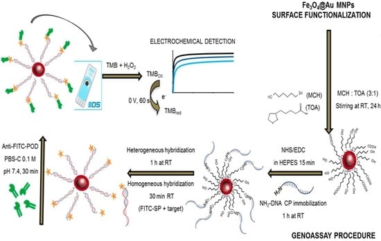- Loaiza, Ó.A.; Jubete, E.; Ochoteco, E.; Cabañero, G.; Grande, H.; Rodríguez, J. Gold coated ferric oxide nanoparticles based disposable magnetic genosensors for the detection of DNA hybridization processes. Biosens. Bioelectron. 2011, 26, 2194–2200. [Google Scholar] [CrossRef] [PubMed]