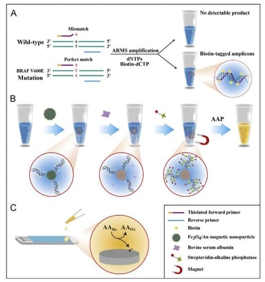 - Situ, B.; Cao, N.; Li, B.; Liu, Q.; Lin, L.; Dai, Z.; Zou, X.; Cai, Z.; Wang, Q.; Yan, X.; et al. Sensitive electrochemical analysis of BRAF V600E mutation based on an amplification-refractory mutation system coupled with multienzyme functionalized Fe3O4/AuNPs. Biosens. Bioelectron. 2013, 43, 257–263. [Google Scholar] [CrossRef] [PubMed]