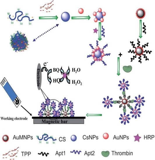 - Zhao, J.; Lin, F.; Yi, Y.; Huang, Y.; Li, H.; Zhang, Y.; Yao, S. Dual amplification strategy of highly sensitive thrombin amperometric aptasensor based on chitosan–Au nanocomposites. Analyst 2012, 137, 3488–3495. [Google Scholar] [CrossRef] [PubMed]
