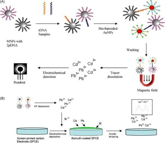 - Zhang, D.; Huarng, M.C.; Alocilja, E.C. A multiplex nanoparticle-based bio-barcoded DNA sensor for the simultaneous detection of multiple pathogens. Biosens. Bioelectron. 2010, 26, 1736–1742. [Google Scholar] [CrossRef] [PubMed]