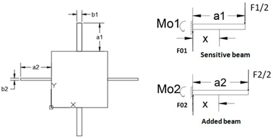 When the acceleration along Z-axis (the normal direction to the sensor chip) is applied on the chip, the beams is involved in a bending movement along with the vertical of the seismic mass. Since there is no rotation in the movement of the seismic mass, displacements of the beams are the same. Dimensions (length × width × thickness) of the sensitive beams and the added beams are a1 × b1 × h and a2 × b2 × h, respectively. Let F1 and F2 be the total forces applied to the sensitive beams and the added beams, as shown in Figure 2. In the analytical model, the mass of the beams and bending of the seismic mass are neglected. According to the basic principle of mechanics and under the assumption of small deflection [], the following equations can be derived: