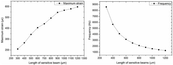 Maximum strain and frequency with different lengths of sensitive beams (thickness is 20 μm; width is 210 μm).
