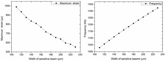 Maximum strain and frequency with different widths of sensitive beams (length is 1200 μm; thickness is 20 μm).