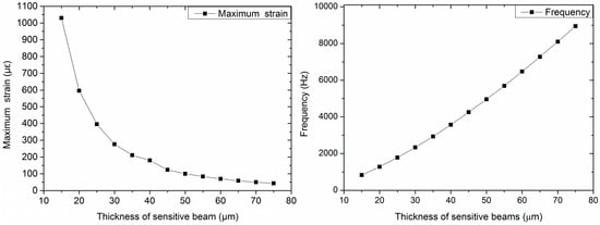 Maximum strain and frequency with different thicknesses of sensitive beams (length is 1200 μm; width is 210 μm).