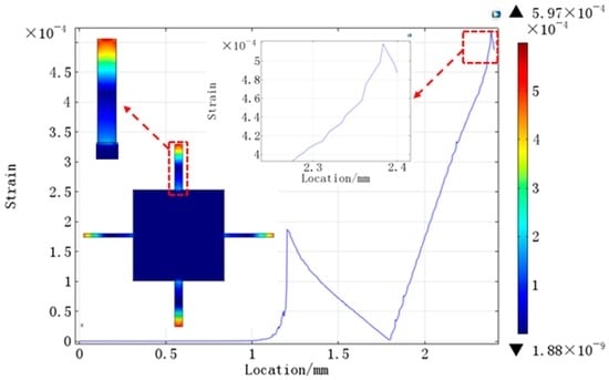 The strain distribution of the structure is shown in Figure 6. Because there are differences between sensitive beams and added beams in the length and width, the strain distributions of the two kinds of beams are different. It can be observed that the maximum strain is generated on the sensitive beams. In order to get high sensitivity, piezoelectric thin films were distributed at the maximum stress spots. As shown in Figure 6, the value of the strain is from the center of the mass to the edge of the sensitive beams. At the edge of the sensitive beams, the value of the strain is up to maximum and the strain focuses on the area from 2.3 mm to 2.4 mm. In order to get the maximum output voltage, the piezoelectric thin films were arranged in this area.