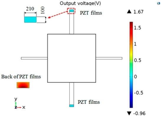 PZT has superior piezoelectric properties compared with other piezoelectric materials []. Therefore, this work focuses on the use of PZT films. The width of the PZT films is the same as that of the sensitive beams. The length of the PZT films is 100 μm, which is at the area from 2.3 mm to 2.4 mm. Considering the actual machining precision, the thickness of the PZT films is 3 μm. Moreover, it is supposed that the top surface of the PZT films is zero potential. The output voltage is shown in Figure 7. The maximum output voltage is 1.67 V, which is in the back of the PZT films.
