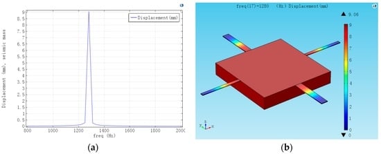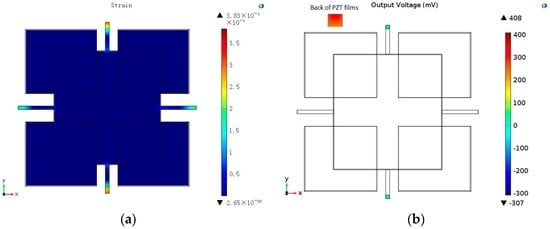 From Equations (18) and (20), it is observed that, if dimensions of the seismic mass and the added beams remain unchanged, the maximum strain of the structure increases with the increase in the length of sensitive beams, while the frequency decreases when the length of the sensitive beams increases. Additionally, as regards the width or thickness of the sensitive beams, the maximum strain and frequency show an opposite result.