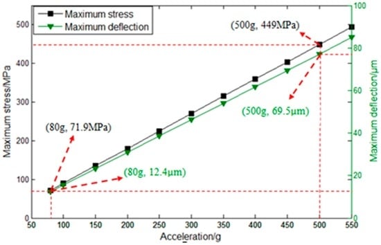 The results are shown in Figure 10. It can be observed that the maximum stress and deflection increase with the increase in applied acceleration. When the applied acceleration is 80 g, the value of maximum stress is 71.9 MPa, and the deflection is 12.4 μm. As the acceleration is 500 g, the value of maximum stress is up to 449 MPa, and the deflection is 69.5 μm. In order to ensure that the maximum stress does not exceed the limit stress of silicon, the space between the glass and the seismic mass must be between 12.4 μm and 69.5 μm. The measuring range can be up to 500 g.