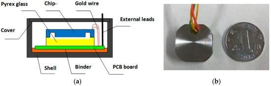 After the accelerometer chip was fabricated, the key problem was how to realize the package of the sensor. The schematic of the packaging and the packaged accelerometer are shown in Figure 14. First, the chip needed to be bonded with Pyrex glass to prevent overload and then cohered with the PCB. The electrical connection between the pads in the sensor chips and PCB was achieved by gold wire. Finally, the accelerometer chip was completely enclosed in the shell.