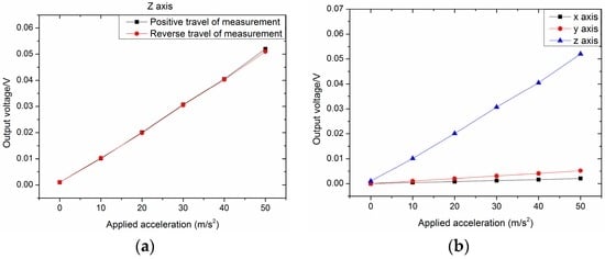 To test the performance of the piezoelectric output of the designed structure, a vibration test was carried out, as shown in Figure 15. The structure was on the vibration table, and different accelerations from 0 m/s2 to 50 m/s2 at 20 Hz were applied. In order to increase the output voltage, the two piezoelectric thin films were in series. The results are shown in Figure 16a. Obviously, the lines of the positive travel of measurement and the reverse travel of measurement match well; the structure kept the linearity satisfied. Based on Matlab, via calculation, the sensitivity of the piezoelectric acceleration was 0.00091 V/(m/s2), the linearity was , and the hysteresis error was 0.0033. To measure the transverse motion of the accelerometer, we only needed to change the installation direction of the sensor. The results are shown in Figure 16b. The sensitivity of the X direction was 3.91343 V/(m/s2), and the sensitivity of the Y direction was 9.78357 V/(m/s2). The results illustrate that the accelerometer is less affected by transverse acceleration.