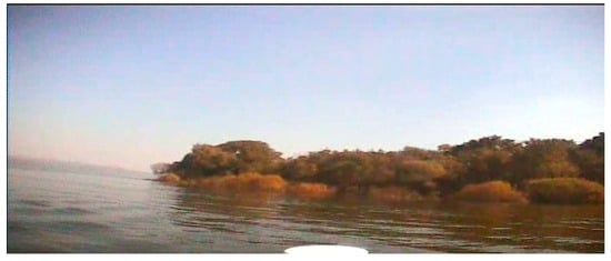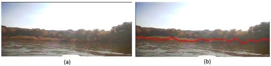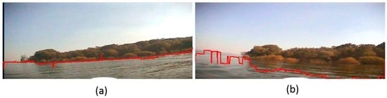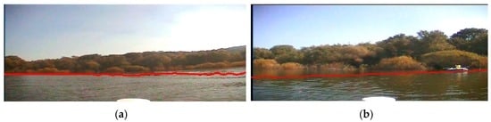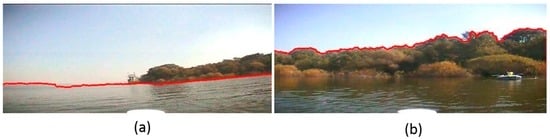 Second, we conduct the experiment on the image which is captured when the USV system is closer to the bank than that in experiment I; however, there is no obvious line between the water area and the bank. The sun is on the top right corner of the image, where is brightest due to the uneven illumination, and on the water area the right side is brighter than the left side. Besides, in Figure 16, there is a mountain which is far away from the water, and the intensity of the mountain is close to that of the water area. Figure 16a and Figure 17a are the original images, and Figure 16b and Figure 17b are the detection results, where we can see that the detected waterlines are clear enough to separate the water area from the trees and the mountain, and the uneven illumination has not influenced the segmentation result.