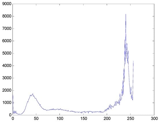 Then, in order to reduce the processing time and to improve the real-time ability of our method, it is necessary to segment the background (i.e., sky in our sample image) which almost has no textures and the intensity is distributed evenly. In this paper, we use the B value from the blue channel in the color image to segment the background, because the B signals of the background area are higher than other signals. Figure 3 is the histogram of the B channel, where we can see that there is an obvious peak when the intensity value is higher than 200. Based on the histogram analysis, we could segment the background area from the sample image, and the result can be seen in Figure 4.