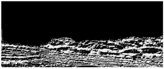 First, we need to define the local searching area. In this paper, we detect a short straight line as the reference line from the LBPs image. Because the texture of water is mostly straight stripes due to waves, rather than circular arcs of trees. It is reasonable to use Hough transformation to extract the straight line, which is the highest and longest, and to define it as the reference line. Then, the reference line is prolonged to intersect the entire image with its slope, and the local searching area is subsequently defined around the referenced line. If the coordinate of the jth row on the reference line is i, we define the searching area along the jth row is [i − Δa, i + Δa]. When we find some unusual peaks appearing on the detected waterline of the first segmentation, we start searching in this scope. Δa can be defined in a real application, and its unit is pixel.