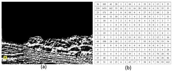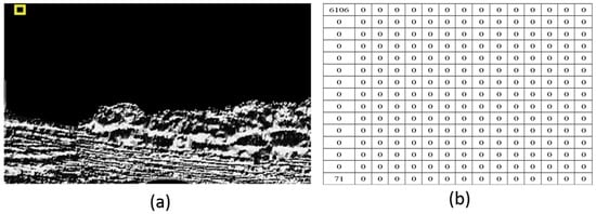 Then, in order to segment the water area after calculation with the LBPs operator, we require an indicator to evaluate the texture variation and to separate two neighboring image blocks. As we mentioned in Section 2, GLCM is a statistical approach considering orientation and distance. Therefore, we use GLCM to estimate LBPs distribution. First, we divide the entire LBPs image into many image blocks and calculate the GLCM value of each LPBs image block. In this calculation, the radius δ is 4 and the orientation θ is 0°, 45°, 90°, and 135°. Figure 6 is the GLCM result when the center pixel is (15, 15) and the block size is 30 × 30. Figure 6a is the LBP image where the block shown with the yellow rectangle is the calculation position; Figure 6b is the calculated GLCM. Figure 7 is the GLCM when the center pixel is (270, 15) and the block size is 30 × 30. Figure 7a is the LBP image where the block shown with the yellow rectangle is the calculation position; Figure 7b is the calculated GLCM. From these figures, we can see that the GLCM is changing along the same column. The reason is that the texture property is changing. Subsequently, we choose the entropy indictor to evaluate the GLCM distribution of each image block. The evaluation method is to calculate the difference entropy between two neighboring image blocks along each column and to obtain the differential curve of this column. The highest difference of entropy value is found when the values of P(i, j) are allocated quite uniformly throughout the matrix. This happens when the image has no pairs of gray levels, with particular preference over others. When GLCM is calculated, the size of each image block may influence the scale of its estimation. Therefore, for optical images with different scenes, normally an optimal size needs to be obtained through practice, and an overlap between two neighboring blocks can be used to reduce the influence of the block size. The size of each image block in this paper is 30 × 30 pixels, and the overlap of two neighboring blocks is 10 pixels.