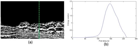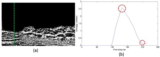The entropy differential curves along two typical columns are shown in Figure 8 and Figure 9. Figure 8a and Figure 9a are the LBP image where the calculation position is shown with the green dashed line; Figure 8b and Figure 9b are the entropy differential curves, where the horizontal axis is the number of difference entropy calculation along each column, and the calculation is from the top of the image to the bottom of the image. The vertical axis is the difference entropy between two neighboring image blocks. In Figure 8b, there are two different areas including the water area and the sky, so only one peak exists on the differential curve, while in Figure 9b, there are some trees between the water area and the sky, therefore we can find two bending points. These points are the separation lines of three different areas, and what we require to do is to detect the positions of the peaks and to define them as the separation positions of this column. The first separation position from bottom to top is what we desire, because the water area is the nearest to the camera.