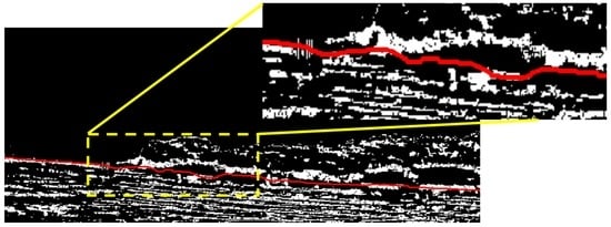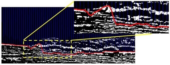 The detection result of Hough transformation can be shown in Figure 11, and we can believe that the true waterline is around the Hough line because the shape of the separation line between the bank and the water area is changing slowly, and it is not reasonable to find some sudden peaks on the true waterline. Therefore, the Hough line and the local searching area can be used to compensate the detection result of the first segmentation when some unusual peaks exist on it, and the searching requirements have been noted earlier. The final segmentation result is shown in Figure 12, and the segmentation result in the area of the yellow dashed rectangle are zoomed and shown at the top-right corner of Figure 12, where the peaks from the first segmentation have been removed, and the detected waterline is smooth and close to the ground truth.