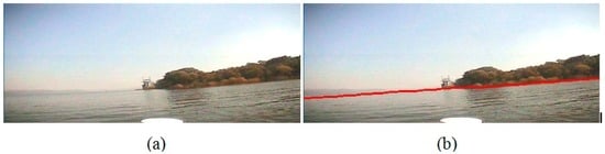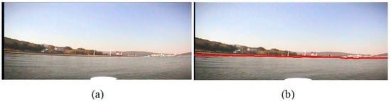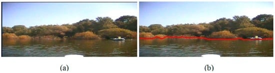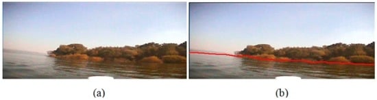 Waterline detection of a far bank and a distant mountain. (a) The image before our detection; (b) The image after our detection.