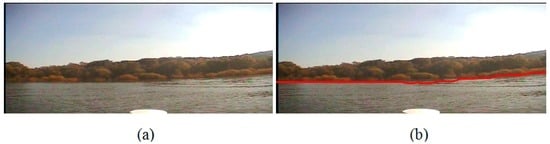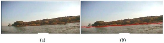 Waterline detection of a far bank. (a) The image before our detection; (b) The image after our detection.