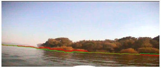 However, when the illumination conditions are so bad that both the trees and the shade of the trees on the bank are dark, it is difficult to judge where the waterline lies, and the detected waterline of our method in this paper has some errors at some positions. The experimental result can be seen in Figure 23. Therefore, in the future work, we will research deeply to improve the performance of our waterline detection method.