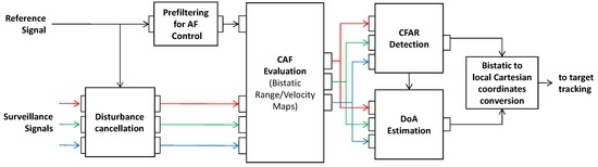 With reference to a basic PR system, the low power signal reflected from the target is collected by the main receiver (typically known as the surveillance channel) using a directive antenna steered toward the surveillance area. Multiple surveillance channels (connected to multiple antenna elements) might be implemented in order to provide spatial diversity and to gain an angular discrimination capability against the received target echoes. Since the transmitted signal is not known at the receiver, an auxiliary PR receiver (typically known as the reference channel) is usually connected to an additional directive antenna steered toward the transmitter.