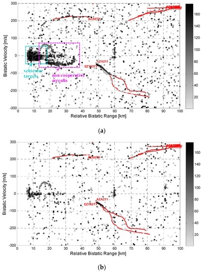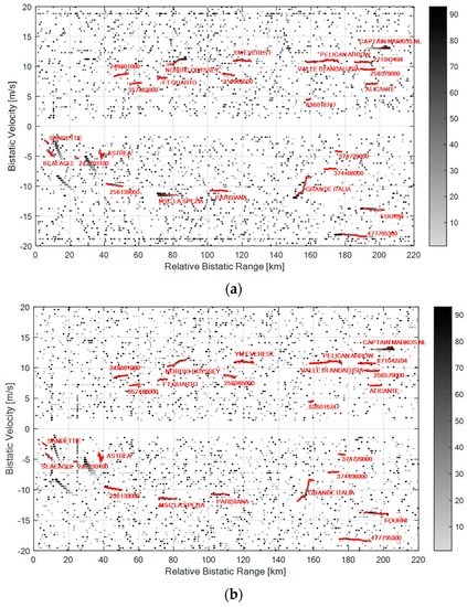 Figure 6a), the system is able to continuously detect the targets appearing between 50 and 60 km at bistatic velocities around −60 m/s, which correspond to aircraft landing at the Fiumicino airport. In contrast, just a few isolated plots are obtained for other target track portions provided by the available air-truth. This might be caused by the higher velocity of these targets that yields migration effects which might limit the coherent integration gain. Moreover, as these targets usually correspond to higher altitude targets, their detection might be prevented by the vertical-plane radiation patterns of DVB-T transmitters that are tailored to avoid wasting too much power above the horizontal.
