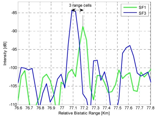 Figure 10a refers to the separate exploitation of SF channels and clearly shows the range misalignment of the resulting plots across consecutive observations. Consequently,