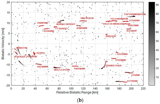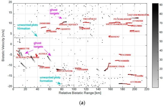 As is apparent, with both the considered single channels, the system is able to detect many targets also at very long bistatic ranges (see for example the vessel labeled “Fourni” at about 200 km or “Capitan Markos NL” at 210 km). In fact, the conceived sensor was shown to provide OTH capabilities in the considered maritime application [