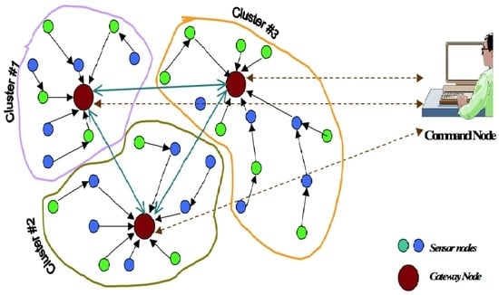 We adopt the sensor network model in Figure 1, which is proposed by Younis et al. []. In this model, the network consists of a large number of sensor nodes distributed over an area of interest. There is at least one command node in charge of the system. The model also introduces some super-nodes, called gateway nodes, in addition to the sensor nodes. The gateway nodes have more computational, energy, memory and communication resources. They act as a gateway between sensor nodes and the end user, as they typically forward data from the WSN on to a command node []. As depicted in Figure 1, the gateways partition the sensors into different distinct clusters. Each cluster is composed of a gateway node and a set of sensor nodes. The operations within a cluster are independent of each other. The cluster sensor nodes transmit the gathered and integrated data to the gateway node of their cluster.