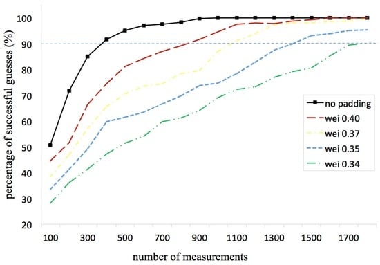 The attacker sends to the gateway node two messages with a certain bit equal to zero and one, respectively (as the two messages g and in []), while the rest of bits are the same. After the gateway node processes each received message, random delays are padded before sending the responses. Different numbers of timing samples are taken from the attacker’s results. When the attacker can tell the time difference accurately from statistical analysis of the samples, we call it a successful guess, and we use the percentage of successful guesses to represent the mitigation influence upon timing attacks exercised by the random padding countermeasure.