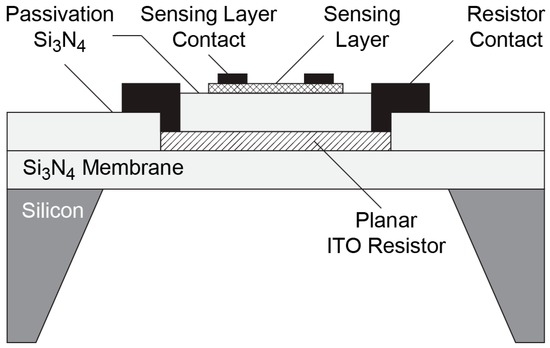 The structure of the metal oxide gas sensor is shown in Figure 1, which demonstrates the cross-section of the gas sensor. As shown in Figure 1, the basic concept of the hotplate is the planar-structured, continuous ITO resistor that lies underneath the active metal oxide layer, isolated with a thin Si3N4 layer.