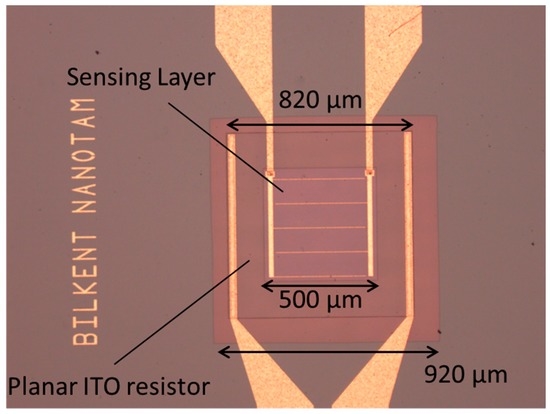 The thermal oxide on the front side of the wafer is removed by reactive ion etching in an inductively coupled plasma reactor (ICP-RIE) (Samco, Kyoto, Japan) using fluorine chemistry. The etching parameters were 75 W ICP, 100 W RF bias power, 0.25 Pa chamber pressure, and 30 sccm CHF3 process gas flow. Then, 1-µm-thick Si3N4 is grown with PECVD as a membrane of the sensor. PECVD Si3N4 was preferred due to its low thermal conductivity [3] in order to reduce the heat losses due to thermal conduction. Si3N4 deposition parameters were 130 W RF power, 275 °C temperature, 75 Pa chamber pressure and precursor gas flow was SiH4 (160 sccm)/NH3 (6 sccm)/N2 (500 sccm). Resistor patterns are defined by reversal photolithography. The ITO resistor is deposited by RF magnetron sputtering system (Leybold Oerlikon, Köln, Germany) using an indium oxide/tin oxide (90/10 by wt. %) target with a 99.99% purity. Deposition is performed at 75 W RF power, 2.2 × 10−3 mbar pressure with a rate of 1.4 Ȧ/s in Ar atmosphere resulting in an ITO layer thickness of 140 nm. After deposition, lift off is done. The 1-µm-thick Si3N4 is grown with PECVD as a passivation layer. The bulk silicon etch mask is defined by photolithography and patterned into Si3N4 by ICP-RIE. The openings on the passivation are etched with ICP-RIE by using CHF3 plasma. A 200-nm-thick SnO2 is deposited as an active layer with RF magnetron sputtering system (Nanovak, Ankara, Turkey) by using the SnO2 sputtering target with 99.99% purity. Prior to the active material deposition, Cr/Au/Pt contact metals are deposited by e-beam evaporation as resistor contacts. Cr/Au thick metal contact pads for the sensing layer are deposited with an e-beam evaporator system (Leybold Oerlikon, Köln, Germany) as well. Bulk silicon etch was performed in 33% KOH solution at 90 °C for the formation of the membrane by using a special wafer holder with backside protection capability. The microscope photograph of the final sensor device is shown in Figure 2. The total heated area, which is also the ITO resistor area, was 820 × 820 µm2 while the overall membrane area was 920 × 920 µm2. The SnO2 active sensing area was 500 × 500 µm2 and positioned geometrically at the center of both the membrane and ITO micro-heater.