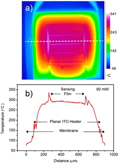 Figure 4 shows the thermal microscope view of the operating device at a 80 mW heating power. As can be seen from the line scan through the center of the heated zone, the temperature difference between the planar resistor contacts is about 30% of the maximum temperature at the center of the heater. However, the temperature change in the SnO2 active layer area was measured to be lower than 7% with a maximum 17 °C temperature difference between the hottest and coldest points. Sudden temperature jumps on the sensor electrodes and heater electrodes were probably linked to the temperature dependence of the metal emissivities, whereas the thermal microscope uses a single emissivity value for each pixel at the reference radiance measurement temperature.