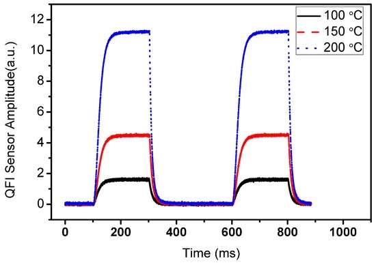 As is commonly used, the rise time can be defined as the time for the sensor to heat up from 10% to 90% of the maximum stabilized temperature. Similarly, the fall time is defined as the time for the sensor to cold down from 90% to 10% of its maximum temperature. Transient measurements were made for three different working temperatures. Heat-up and cool-down times of 40 ms and 20 ms were obtained, respectively. These values can be improved by reducing the size of the heater areas inside the thermally insulating Si3N4 membranes to reduce heat leakages. Also, by using a low-pressure PECVD (LPECVD) membrane and passivation layers with low intrinsic stress, the film thicknesses can be further reduced. In this way the thermal mass can be reduced and the rise-fall time values can be improved.