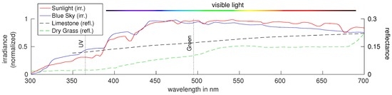 Irradiance spectrum (solid lines) of sunlight [7] (red), clear blue sky [8] (blue) and reflectance spectra (dashed lines) of limestone [9] (black) and dry grass [9] (green). The peaks of the glass filters used to obtain images in the UV and green channel are depicted (dotted lines). Note that the green channel is inspired by the insect Cataglyphis bicolor and does not match exactly with the perception of colors by humans (color bar). [Figure created by author from data in [7,8,9].]