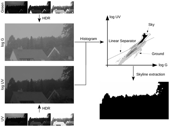 Overview of the different processing steps: For each channel (UV and green) the raw input images with varying exposure times (left, small images) are combined into HDR images (left, large images). Afterwards, a 2D histogram is built (right, top), showing the distribution of the log UV and log G values for each pixel of either a database of multiple image pairs (“global” methods) or of a single image pair (“local” methods). Finally, a linear separator is used to classify each pixel as either ground or sky, providing an image of the skyline (right, bottom) which is widely illumination invariant.