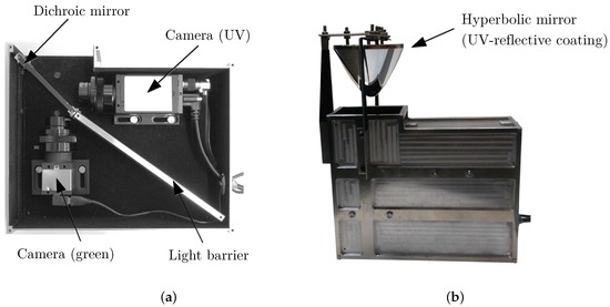We built a setup containing two cameras, sensitive to UV and visible light, respectively, which are separated by a dichromatic mirror (Figure 3), allowing both cameras to record the same scene simultaneously. The cameras have been equipped with additional filters to limit the received range of light, that is nm for the UV camera and nm (green) for the other camera. The resulting relative sensitivities with all optical components involved (cameras, filters, mirror) can be seen in Figure 4. For detailed information (e.g., individual spectra for the used filters, mirrors and cameras), see [19].